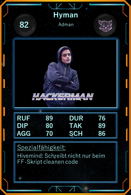 „Bei der Macht des Servers — ich habe den Code!“ - hallte es durch die Universen In den Weiten des Pr0game lebt auf dem Planeten Hy-Definition Prynz Adman. Tagsüber wirkt er wie ein gewöhnlicher Operator, ruhig und ordnend in den Datenströmen. Doch wenn die Systeme in Dunkelheit versinken, zeigt sich seine wahre Identität: @Hyman/Adman Mit der Macht des FF-Scripts und dem Wissen des Servers wird er zum stillen Wächter der Galaxie — dem Meister des Codes, der Flotten lenkt und das Universum vor dem Chaos schützt. Wenn Lag und Bugs die Welten bedrohen, steht Hyman bereit. Kein Fehler ist zu groß, kein Bot zu heimtückisch. Zwischen Bytes und Planeten kämpft er gegen Inaktivität, Spambots und Abstürze. Denn wo andere nur klicken, codet Hyman — und so lebt seine Legende weiter, im endlosen Kampf um Ressourcen, Ruhm und Stabilität. |